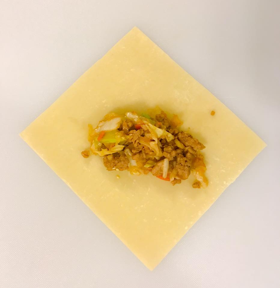 - Drain any excess liquid from the mixture. Fill 12 egg roll wrappers with the mixture.