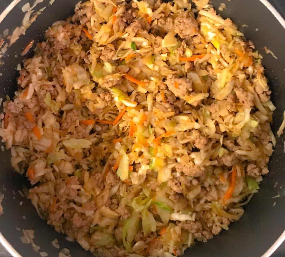 - Add the soy sauce and coleslaw mix. Cook this until the coleslaw is tender. Stir in the sesame seeds.
